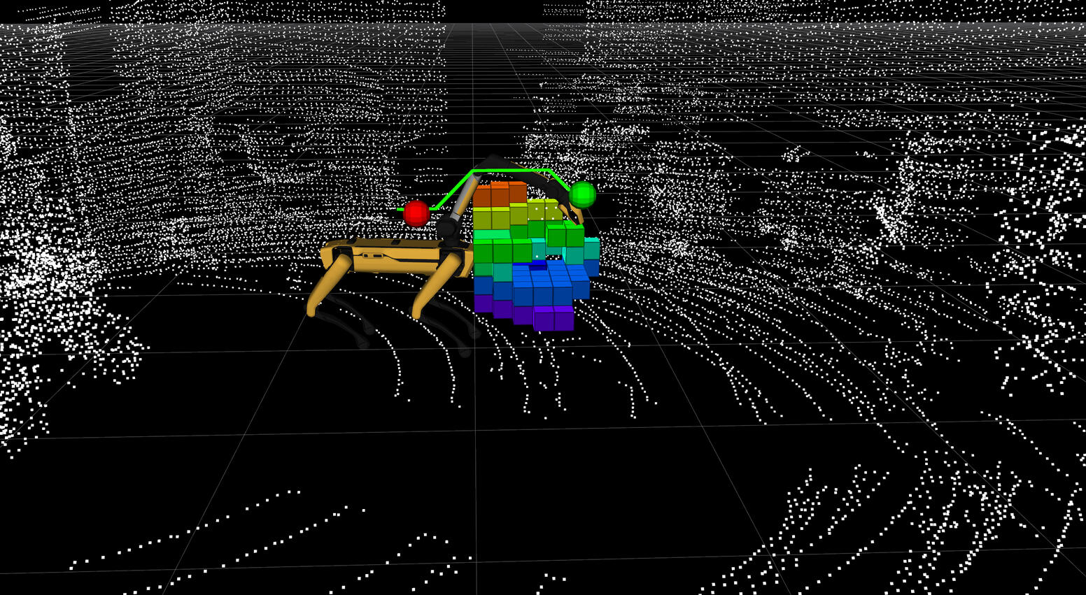 That is a radiation sensor attached to the manipulator's jaw for performing the detection, and it has its built-in depth cameras (five of them) and a 3D lidar for geometric awareness of the surroundings. Below you can see the reconstructed environment and the selection of a local region for planning the arm trajectory with A*.