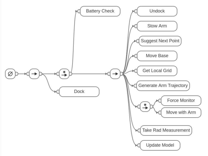 Why is something as simplistic as A* being used for manipulator motion planning? The approach being used is to model more flexible behavior and see how robust it is for the task at hand. Think of this reactive behavior approach as inspired by BEAM robotics where simple analogue circuits are used to make small robots with behavior. The downside to this approach is that the outcome is very application specific. Since the behavior is being modeled for radiation monitoring, it wont be transferable to having the same robot try to paint walls, or swap tables. We are not fully adopting a BEAM robotics philosophy, but rather trying to balance between complexity and simplicity. The behavior tree below shows the flow for the robot when performing mapping. The * indicates a reactive sequence instead of a regular one.